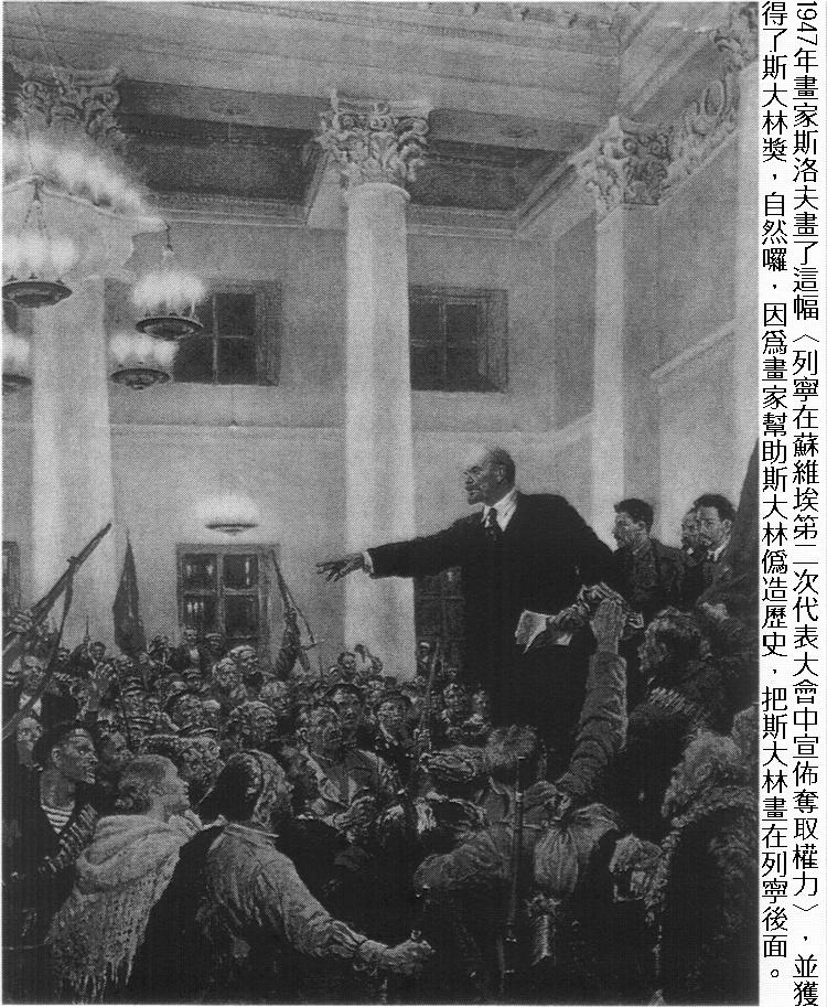 | 中文马克思主义文库 -> 图片馆 -> 【图库】斯大林伪造照相馆 斯大林伪造照相馆 历代的当权者为了巩固其政权,常常会用各种手段捏造及歪曲真实的历史,以达到愚民的效果,方便其统治。这种捏造历史的情况似乎在那些完全不受人民监督,拒绝任何方式的民主政治,却整天自称是代表人民的伪社会主义政权尤其严重。这里要介绍给读者的是一部难得的有关伪造前苏联历史的照片集,整个伪造过程的幕后黑手不是别人,正是在俄国1917年革命退潮中用尽一切阴谋手段去夺得统治权的独裁者史太林。在他掌权期间,不但进行大规模的清洗计划,把知情者及政治上的异己甚至自己的支持者一一从肉体上消灭,同时任意修改保存历史真相的珍贵图片及艺术品,为的是要消灭俄国十月革命的主要领袖(例如托洛茨基)的历史痕迹,同时伪造自己才是主要领袖的记录,为的是创造全国上下对他的个人崇拜。 幸好,历史最终不是按个人的意志行事的,更不容永远被歪曲。经过有心人的搜寻及研究,被埋没几十年的真相终于又再呈现在公众眼前。这本书叫《人民委员突然消失了》(The Commissar Vanishes),副题是史太林时代对照片及艺术的伪造,作者是英国图像历史学者David King。1997年版。 根据作者的介绍,资料的收集工作始于1970他的一次苏联之旅,当时他发现成千上万在史太林政权治下的受害者影像消失了,于是决定找出真相。之后他花了约三十年时间从各种各样的照片、书籍、海报以及印刷品中收集到廿五万份图像,并选出最精彩的部份收录在这图片集里。 读者会从这部精彩的著作中看到,史太林如何利用图片科学的技术来达到他个人的政治目的,把所有不利于巩固他个人权力的历史人物从照片中剔除。他命令官僚用无所不用其极的手段去窜改历史图像。其中包括把照片中的人物用喷漆涂污,删除图片中原有的人物,窜改群众场景等等。本书采用的封面就是其中一幅著名的照片:三名苏共高层干部在不同时期刊登的官方照片中陆续消失,最后只剩下史太林一人!类似的手法在其它地方出现过无数次。他尤其用心去捏造他在革命伊始已是列宁的亲密战友,以及消灭人们对革命第二号领袖人物托洛茨基 (史太林的宿敌,后被史派遣的格别乌杀害) 的记忆,照片中许多领袖人物在史太林手上最后只变成一堆干草,沼泽,耕地,梯级或干脆黑漆一片... 书中所用的部份图片是来自一位出色的前苏联艺术家的个人珍藏,其中有些人物──许多是被史太林认为是异己而遭清洗掉的──的面容都遭深色墨水涂污至难以辨认。