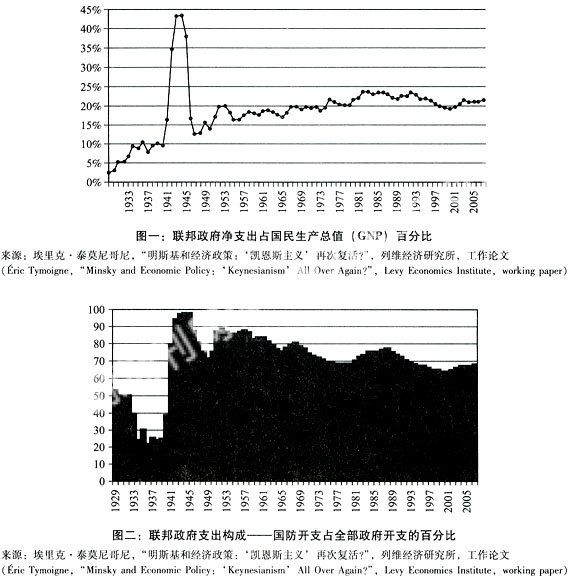 国家支出的日益重要性以及中央银行和政府迅速花钱以应付危机的意愿表明,要使经济正常运行需要一个最起码的(政府开支)需求,如果低于这一水平那么经济就不可能正常运行,但是在上世纪30年代早期,情况并非如此。在当前这些开支当中,8000亿美元的军费开支——按现在美元价格计算,它是2001年军费的2倍——起着特别重要的作用,因为它能保证一小批极其重要的核心公司获得市场。这种开支可以明显地缓和危机的影响,虽然每单位军事开支带来的对提高就业的影响比过去(如跟1951年朝鲜战争期间相比,当时单位军事开支带来的就业机会达到最大值)大幅减小。