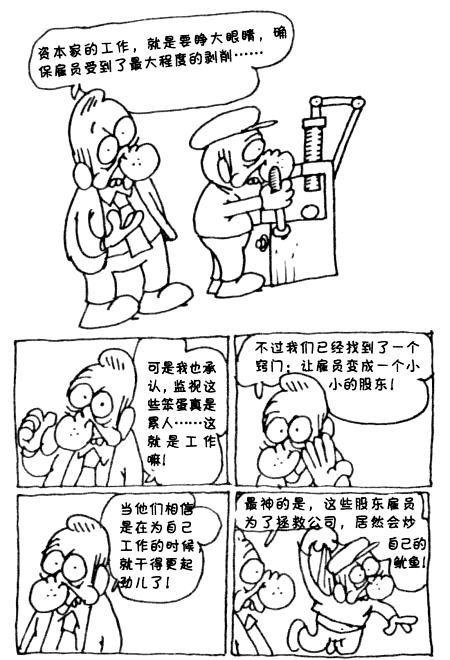 而其结果,就是马克思所说的“工业病理学”。随着雇员股份制的出现,这种病理学达到了精神分裂的程度:劳动者被非自愿地分割成雇员和股东两部分,从此,股东们便会有兴趣剥削自己乃至解雇自己,以提升他所持的股份的价格!