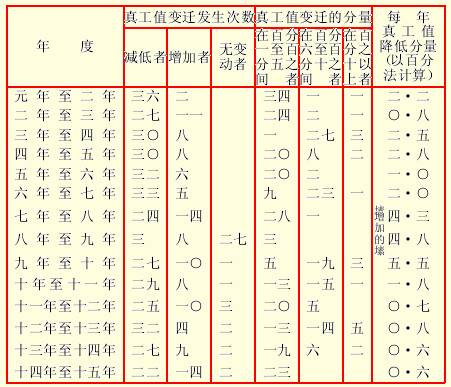 下表以三十八个工会的工值为标准,虽然不能概括全体,至少可以表示一部分。从下表看起来,工资增加的仅只九、十两年,其余各年都是降落。虽然十二年至十五年期间,减低工资的事情,发生的次数,每年递减;然而在总平均数计算起来,事实上工资确未增加。