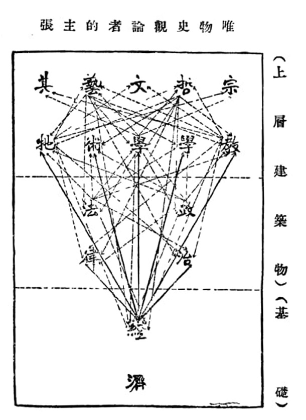 这一段话在一方面表明上层建筑物如政治,法律,宗教,哲学,文学,学术等等对于历史的争斗的经过都有影响,在另一方面表明经济的基础是决定一切的最后的要素。例如上面所举英国一八二五年取消欺诈条例使商业与运输发生革命,虽为政治影响经济的明证,然没有十八世纪下半期的经济革命,使大规模的企业成为当务之急,即不会有取消这种条例的事实出现。所以经济成为“决定一切最后的要素”,是确切不移的。在唯物史观论者与多元论者间有一个根本不同之点,今为使读者易于了解起见,特图解于下。