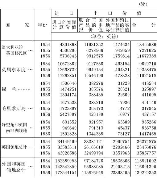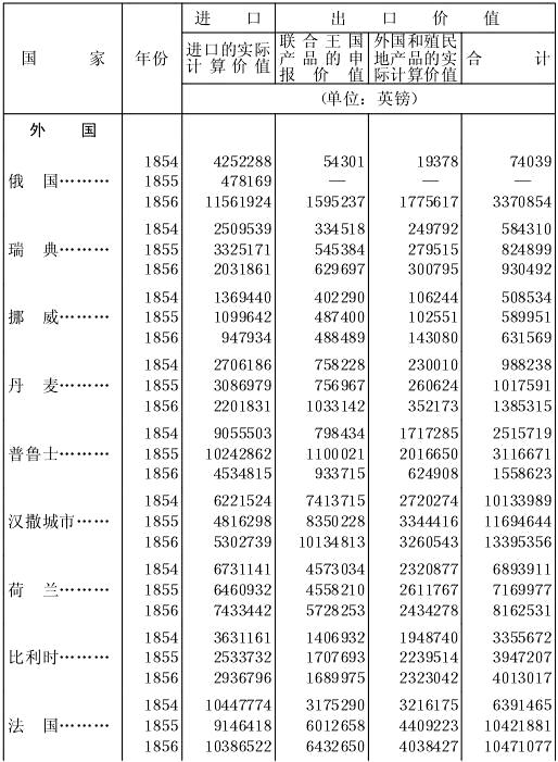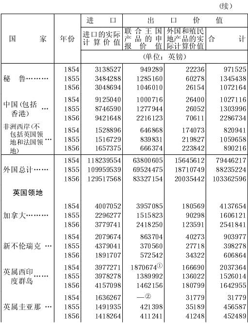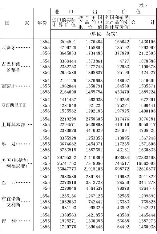 根据奥尔德利的斯坦利勋爵所提供的数字,我们编制了以下这个表格,说明与大不列颠通商各国的出超或入超的程度: