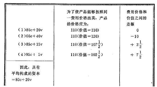 根据我们的假定,平均的非农业资本的比例=80c+20v,剩余价值率=50%;所以剩余价值=10,而利润率=10%。因而,具有平均构成的资本100的产品价值等于110。