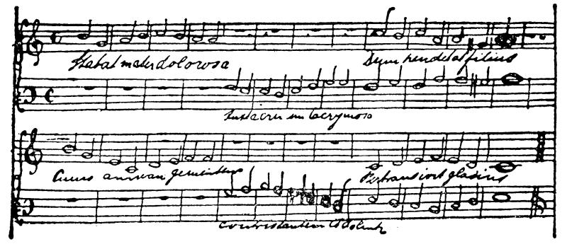 伴奏曲尚未写成,我以后可能还要做些改动。一看便知,除第四行以外,大部分都抄自赞美诗集。歌词是著名的拉丁文赞美诗:“Stabat mater dolorosa Juxta crucem lacrymosa Dum pendebat filius”[注:“圣母悲痛地站在十字架下,泪流满面,望着钉在十字架上的儿子”。(这是天主教的圣母赞美诗的开头部分,很多作曲家把它谱成曲子,其中有佩戈莱西、帕勒斯特里纳、罗西尼。)——编者注]