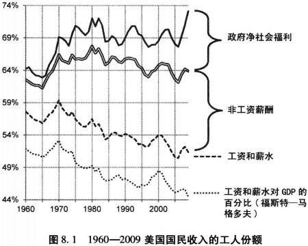 图8.1比较了福斯特和马格多夫的结果和我以如下方式得到的结果,即把非工资薪酬和政府净社会福利计算在内,同时衡量工人的收入对国民收入的份额而不是对GDP的份额。自1960至2007年间,工资薪水对GDP的份额和对国民收入的份额下降了6.2和5.8个百分点。但是总薪酬对国民收入的份额上升了0.8个百分点,在政府净社会福利也被包含进去时工人的国民收入份额上升了5.0个百分点。自1970至2007年间,工资薪水对GDP和对国民收入的份额下降了7.5和7.6个百分点。但是总薪酬对国民收入的份额只下降了3.0个百分点,而在政府净社会福利也被包含进去时,工人的国民收入份额上升了0.1个百分点。[3]
