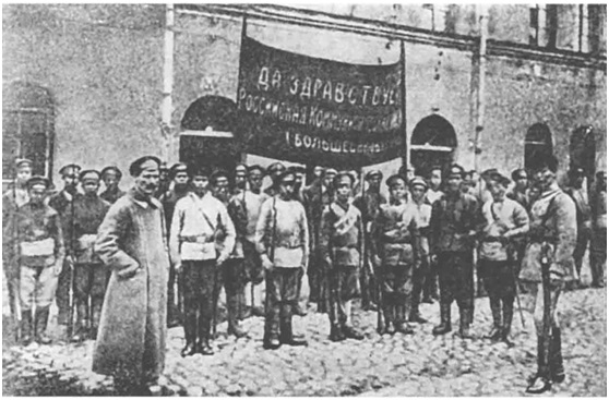 中国营准备开赴前线。旗帜上写着“俄国共产党(布尔什维克)万岁!”