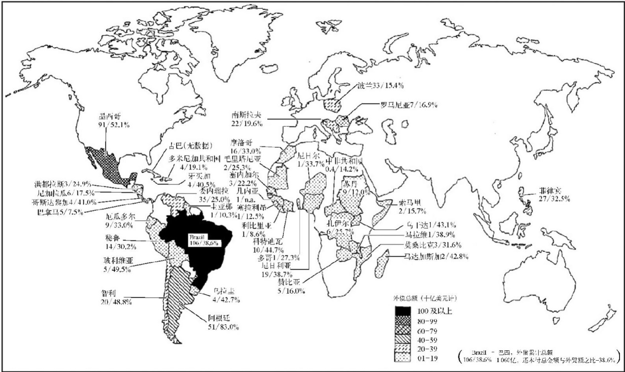 金融危机既是地方性的,也是蔓延性的。1980年代的债务危机不仅限于墨西哥境内,还影响到了全世界(见图4.2)。[7]而在1990年代,两次相互联系的金融危机造成了一条不均衡新自由主义化运动的负向轨迹(negative trace)。例如,1995年袭击墨西哥的“龙舌兰风暴”几乎立即扩散,给巴西和阿根廷造成毁灭性影响,而在智利、菲律宾、泰国和波兰也能感受到余波。很难清楚解释这种扩散模式何以发生,因为金融市场的投机活动和投机预期并不必然取决于实际发生的事情。但是,不受管制的金融化过程显然引起了扩散危机的严重危险。金融家的“一窝蜂心态”(没有人希望成为货币贬值的牺牲品)可能靠自身实现预期。这些活动可以采取侵略性或防御性的表现形式。货币投机者迫使欧洲政府在1993年7月放宽欧洲汇率机制,这些投机者借此赚了几十亿;同年10月,乔治·索罗斯凭借打赌英国无力将英镑控制在汇率机制限度内,一个人就在两周内赚了近十亿美元。