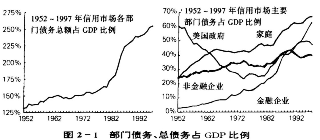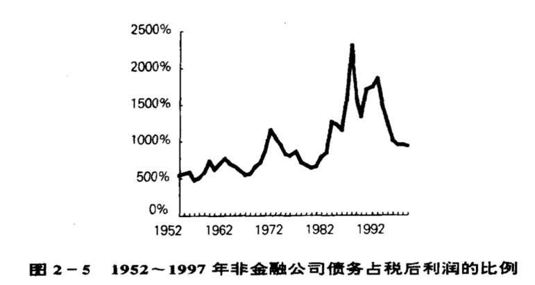 图2-2 1952~1997年美国净信用市场债务在世界上的位置;占GDP比例