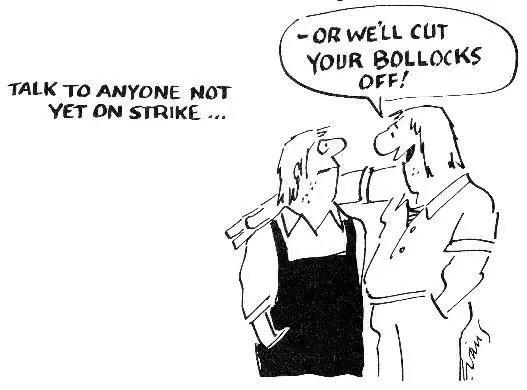 右上文字——(参加罢工)不然我们要割掉你的鸟蛋!(Or we’ll cut your bollocks off!)
