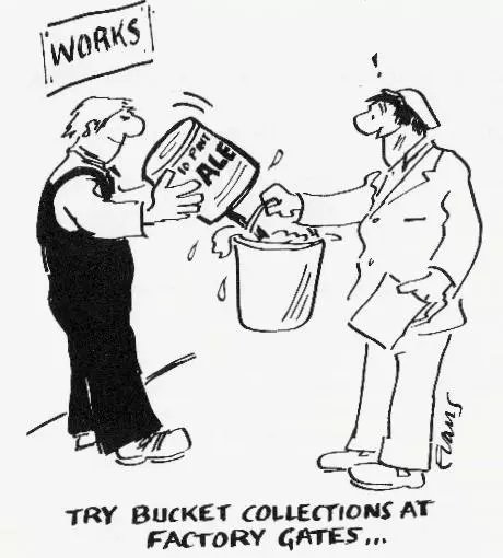 ——各工厂范围的募捐和筹款。再次造访当地的各个工作场所——尤其是那些你们去过而且反响不错的地方——这次你们应要求在工厂范围内募捐,在大门口摆放用于募捐的小桶,向工会成员提出自愿捐款。