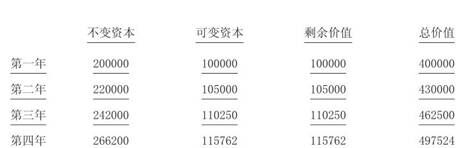 如果经济一开始有200000单位的不变资本和100000单位的可变资本,剥削率为100%,总量上表示的经济增长过程如下: