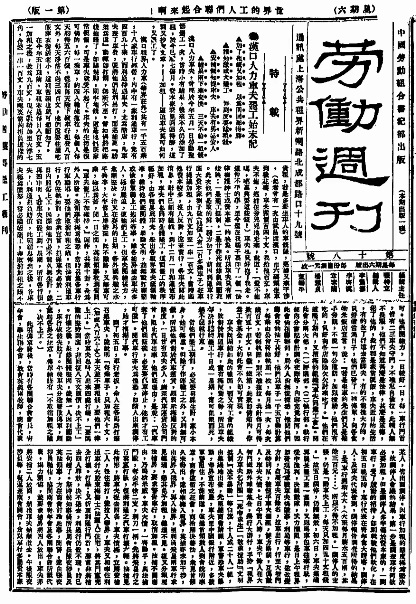 《劳动周刊》是中国劳动组合书记部的机关报,于1921 年8月20日在上海创刊,主编为李启汉。该刊以“为劳动者说话,并鼓吹劳动组合主义”为宗旨,是中国共产党创办的第一个全国性工人报刊。1922年6月,主编李启汉被上海工部局逮捕,该刊也被借口“登载过激言论”“鼓吹劳动革命”勒令停刊。