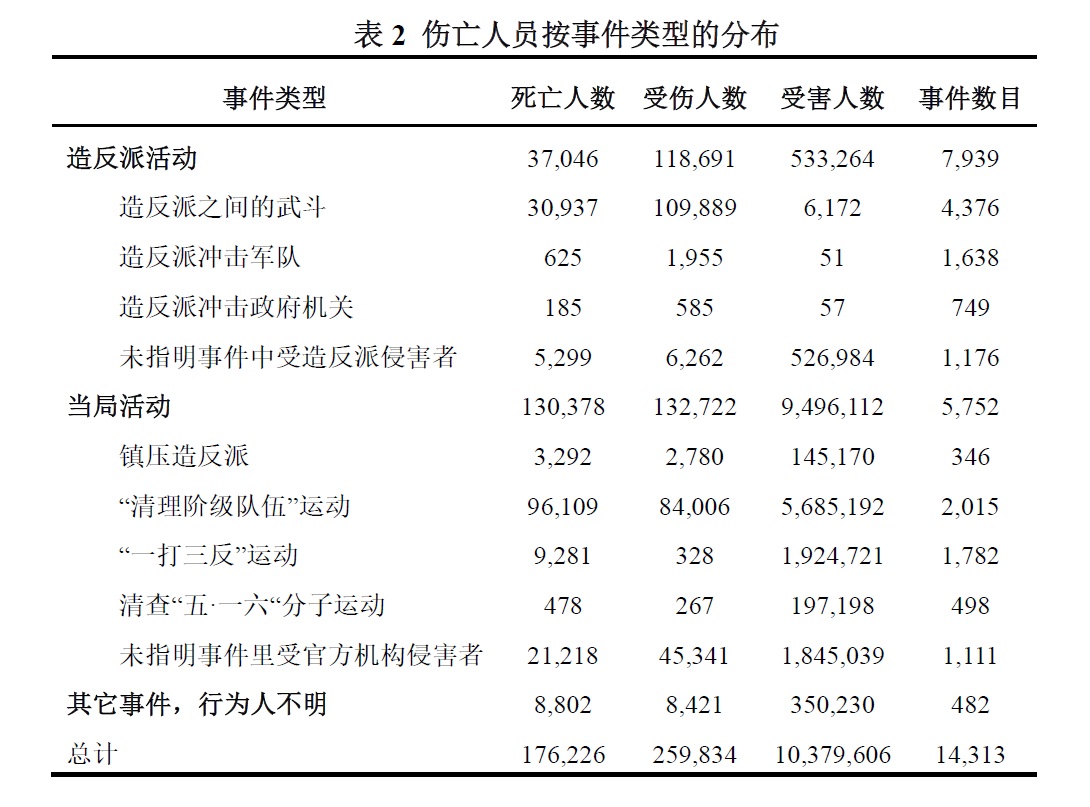 这张表阐明了造成死伤的原因。在造反派一方,绝大多数死伤来自不同造反派派系之间的武装冲突。造反派对政府和军队的冲击造成了少量的死伤。另一方面,绝大多数由造反派造成的受害者都受害于“未指明”的事件;这些事件(下详)主要发生在这一时期的前八个月里,当时造反派对准的目标人物受到攻击,遭到批斗和监禁。简而言之,造反派确实需要为导致许多人死亡负责,不过这最可能是杀了其他造反派。