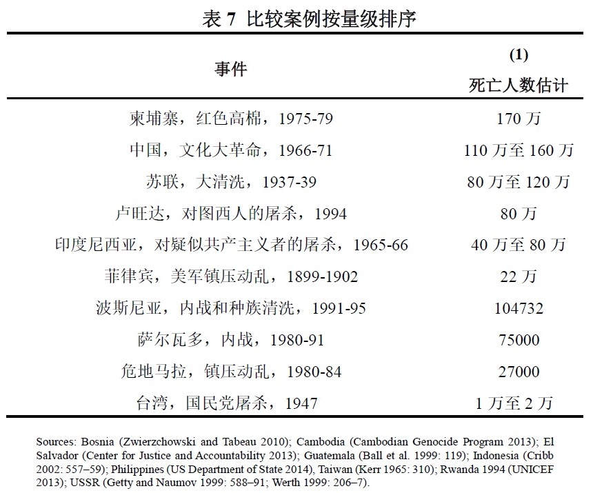 斯大林统治下的苏联和红色高棉统治下的柬埔寨都没有发生大规模的动荡和武装冲突。中国仅有的与这两个案例可比的时期是1968年,此时镇压是由地方的文职政府和武装力量、而不是由国家一级的安全机构进行的。即便广西的人口死亡率接近3.3‰,也没有十分接近波黑战争和美菲战争的人口死亡率:后两者的人口死亡率约为2.5%到2.8%,是前者的9倍。中国最初的动荡和随后的派系斗争远不如萨尔瓦多内战的破坏力大:萨尔瓦多内战迫使武装部队与广泛的、武装精良的民众作斗争。中国重新恢复政治秩序的镇压的残酷程度,只及危地马拉20世纪80年代镇压暴乱的一半。1965-66年印尼和1994年卢旺达屠杀的显著特征是地方文职政府的广泛参与,这一特征在中国则尤为明显,特别是在广西省(苏阳 2006, 2011),尽管我们的数字表明该省的人口死亡率远低于卢旺达,也略低于印度尼西亚。与中国的“清理阶级队伍”最为相似的,是柬埔寨的红色高棉大清洗。据说,清除柬埔寨人民中所有受旧社会污染分子的努力,部分是受到这一时期毛主义教条的启发(Chandler 1999: 66–67; Kiernan 2002: 330)。