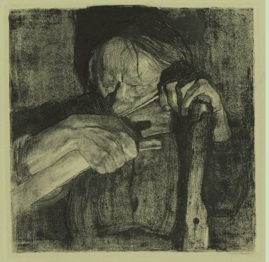 凯绥·珂勒惠支,组画《农民战争》第3幅,《磨镰刀》。线形蚀刻,铜版雕刻,砂纸打磨,飞尘腐蚀法,带有直纹纸和齐格勒复印纸印记的柔软地面。(来自维基共享(wikimedia commons))