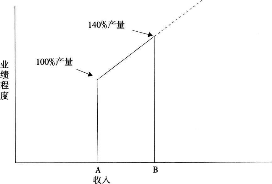 在这两个图中,A 对应的是产量等于或小于 100%的“基本收入”。A 到 B 这一部分是 140%的产量得到的奖金。“业绩”根据产量衡量。标准产量是 100%。工人产量超出 100%开始挣激励性奖金。(“预期的”产量比例是 125%。参见第四章。)