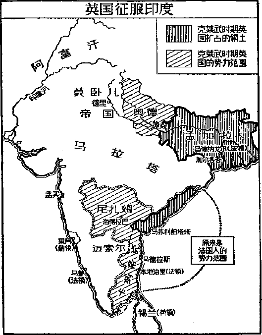 十八世纪的印度是非常软弱和混乱的。莫卧儿帝国正在瓦解,它的地方官吏正自立为独立的统治者。一般情况与中世纪初年欧洲的情况不无相似之处。法人和英人私养的军队有远为优良的武器,所以能参预本地统治者的内战并起决定性的作用。两国人始各竞立国王,拥立他们所能控制的傀儡君主。
