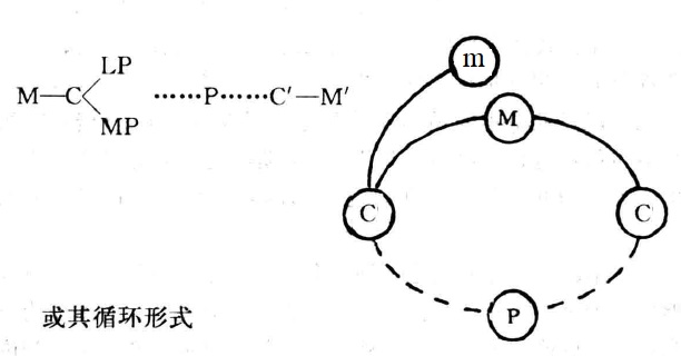 如果我们从货币资本(M)开始,它要与商品(C)相交换,商品(C)的一部分,是由物质生产手段(MP)所构成的,其价值是不变资本(C);另一部分是由劳动力(LP)所构成,其价值是可变资本(V)。这些生产要素是通过交换而结合到一起来的,这是资本主义生产方式所特有的方法。它们在资本主义生产关系下进行生产,而且在循环的这个阶段,资本采取了生产资本的形式。生产过程的结果是创造出由资本家所占有的新商品(C′),由此资本采取了商品资本的形式。这些商品的价值大干所投入的商品的价值,这种超额部分是是由劳动力在生产过程中所生产的超过劳动力价值的部分。结果是商品含有剩余价值,当它们出售换成货币(即交换或实现),资本又重新采取了货币形式(M′),但其数量超过了循环开始时的货币资本量。这种循环可以表示如下: