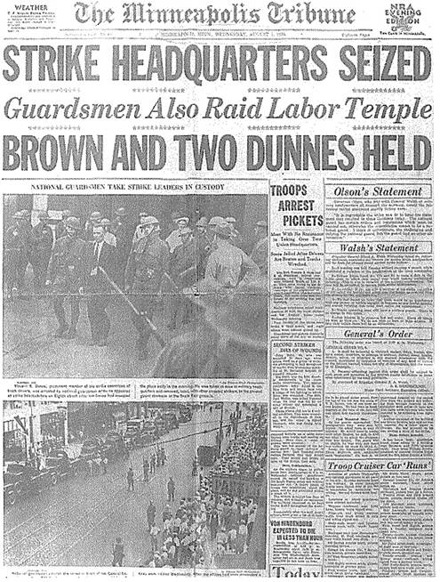 1934年8月1日的《明尼阿波利斯论坛报》在头版报道了574分会总部被查抄的消息,上面的照片是文·雷·邓恩被国民警卫队抓走时的情形。