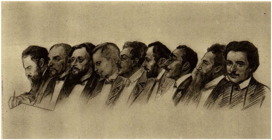 被传唤的证人近400人,其中有超过200人出庭作证[4]。工人、工厂主、宪兵、工程师、佣人、普通人、记者、邮政电报官员、警察局长、中学生、杜马代表、贵族、参议院、流氓、工人代表、教授和士兵在这整个月里,就像阅兵一样,在法庭面前,在检察官、辩护人和被告人(特别是被告人)提问的交锋下,坐在法庭的长椅上,一行一行、一笔一笔地重现了工人苏维埃活动时代一系列事件的丰富画面。