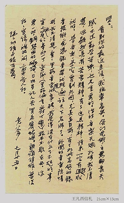 看到你的最近来信,我非常高兴。各门艺术,主要都靠天赋,不过勤学苦练,也是重要的。你的音乐天赋如何我不清楚,但显然具有苦学精神。有了这点精神,将来一定有所成就的。学音乐,不一定要到外国,尤其在目前,有了如此高超的录音技术,光凭录音带就能遍访天下名师了。外国的音乐院情形如何我不清楚,看看里兹学院的章程,我觉得没有什么了不起的。事实上只等于参加一个乐队(里兹偏重爵士乐),根本不教东西。你要一些钢琴曲的磁带,日后当托人去买来寄给你。头疼的很,无法好好写信。就此,问家中各人好。